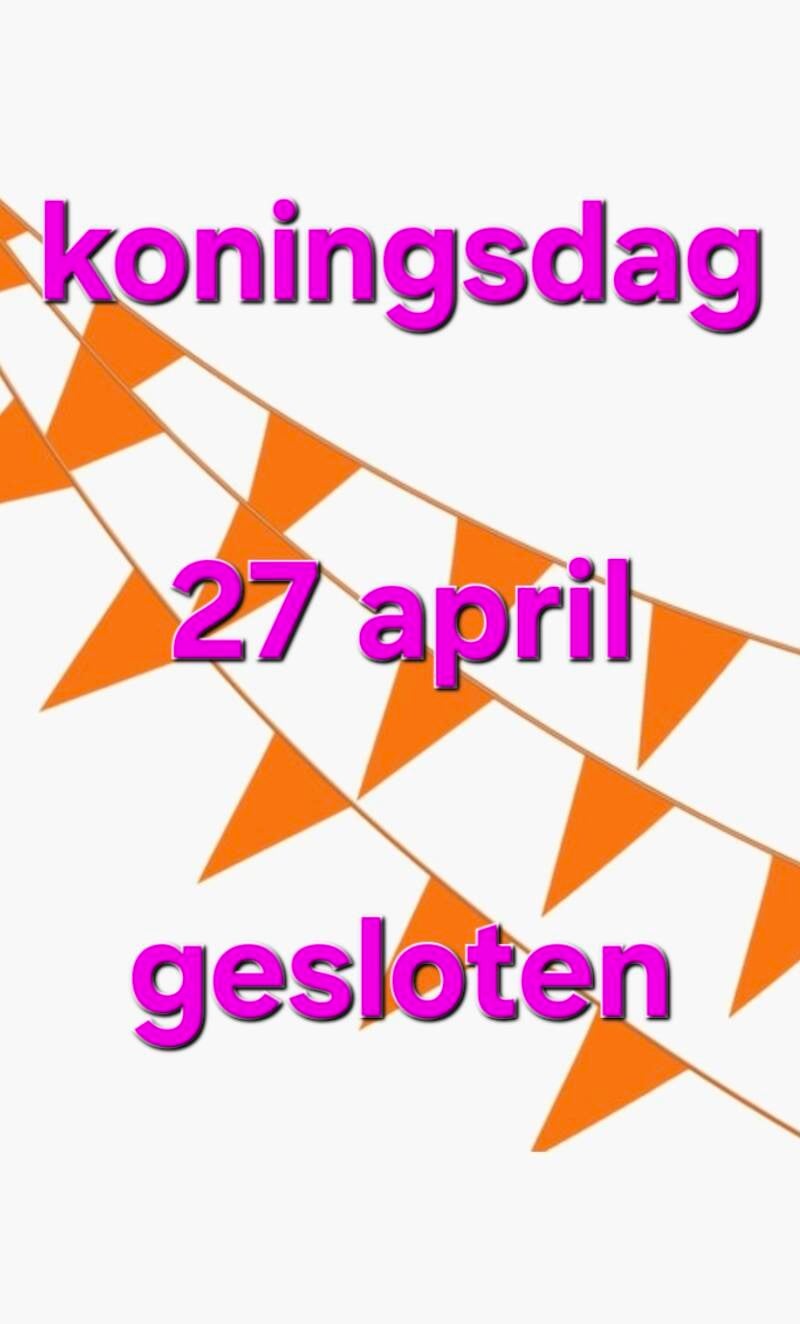 Op 27 april (Koningsdag) zijn wij gesloten; ook wij willen wel eens lekker naar een rommelmarkt.